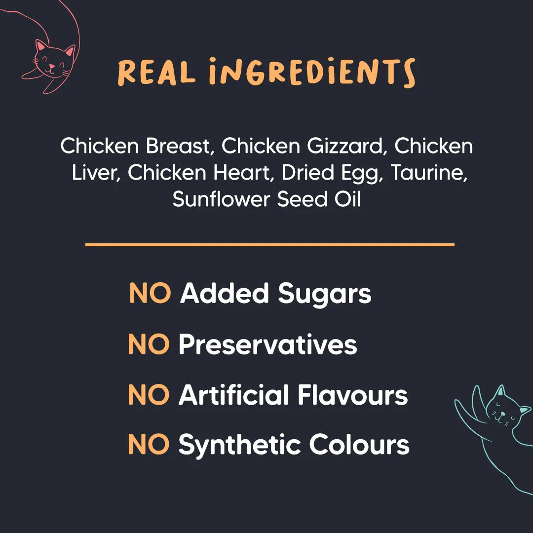 - Real Ingredients: Chicken breast, Chicken gizzard, Chicken liver, Chicken heart, Dried egg, Taurine, Sunflower seed oil
