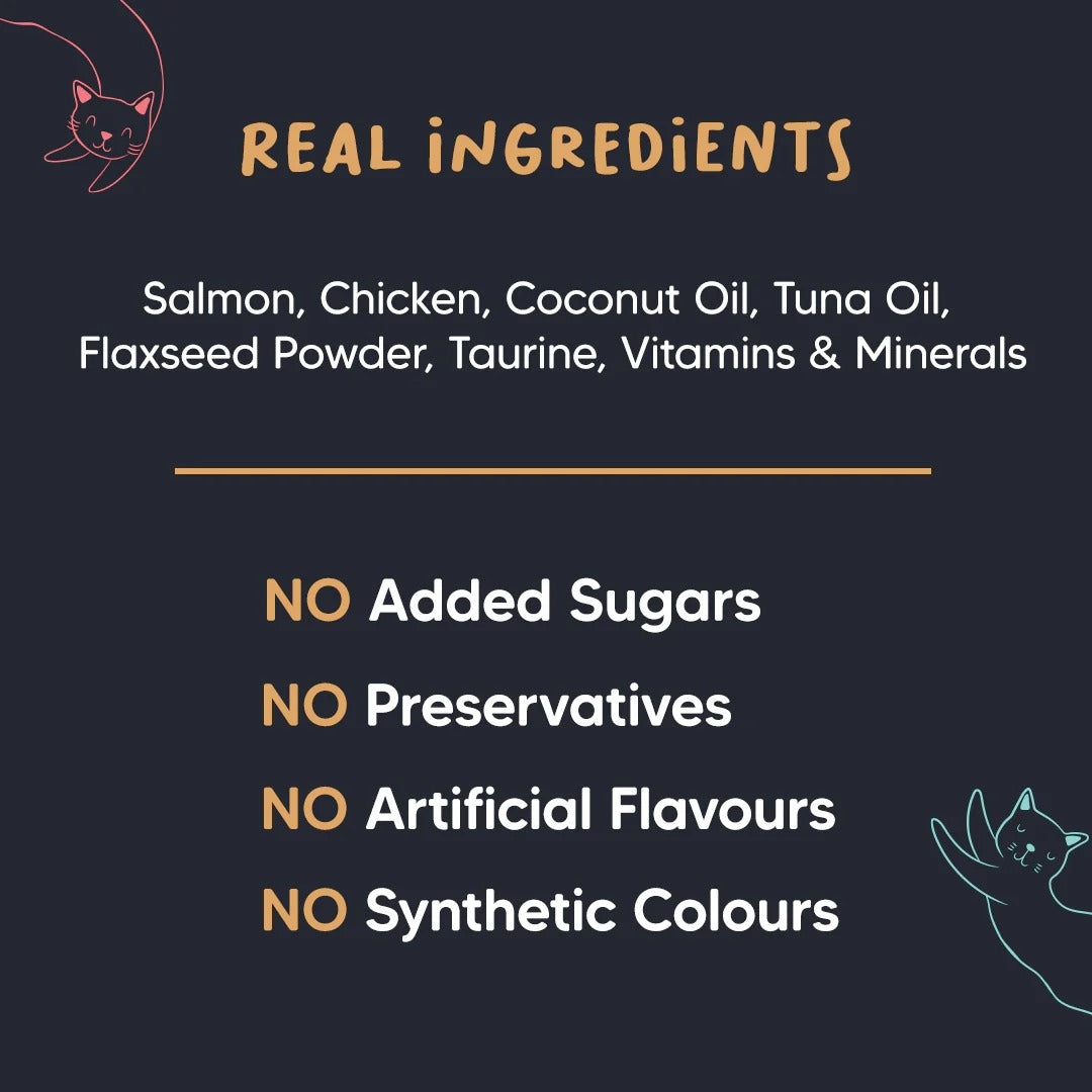 - Real ingredients: Salmon, Chicken, Coconut Oil, Tuna Oil, Flaxseed Powder, Taurine, Vitamins & Minerals.