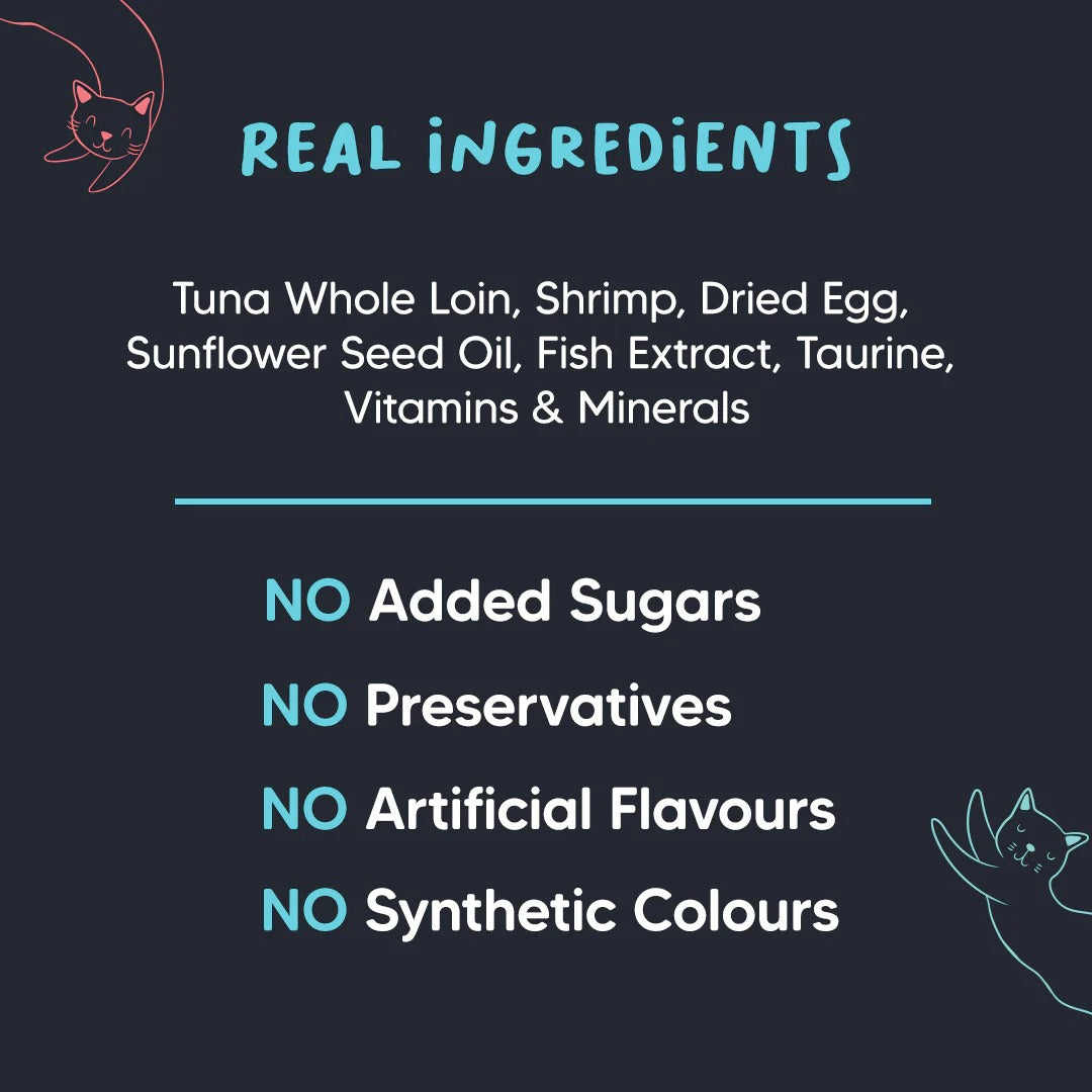 - Real ingredients: Tuna Whole Loin, Chicken Breast, Dried Egg, Sunflower Seed Oil, Fish Extract, Taurine, Vitamins & Minerals.