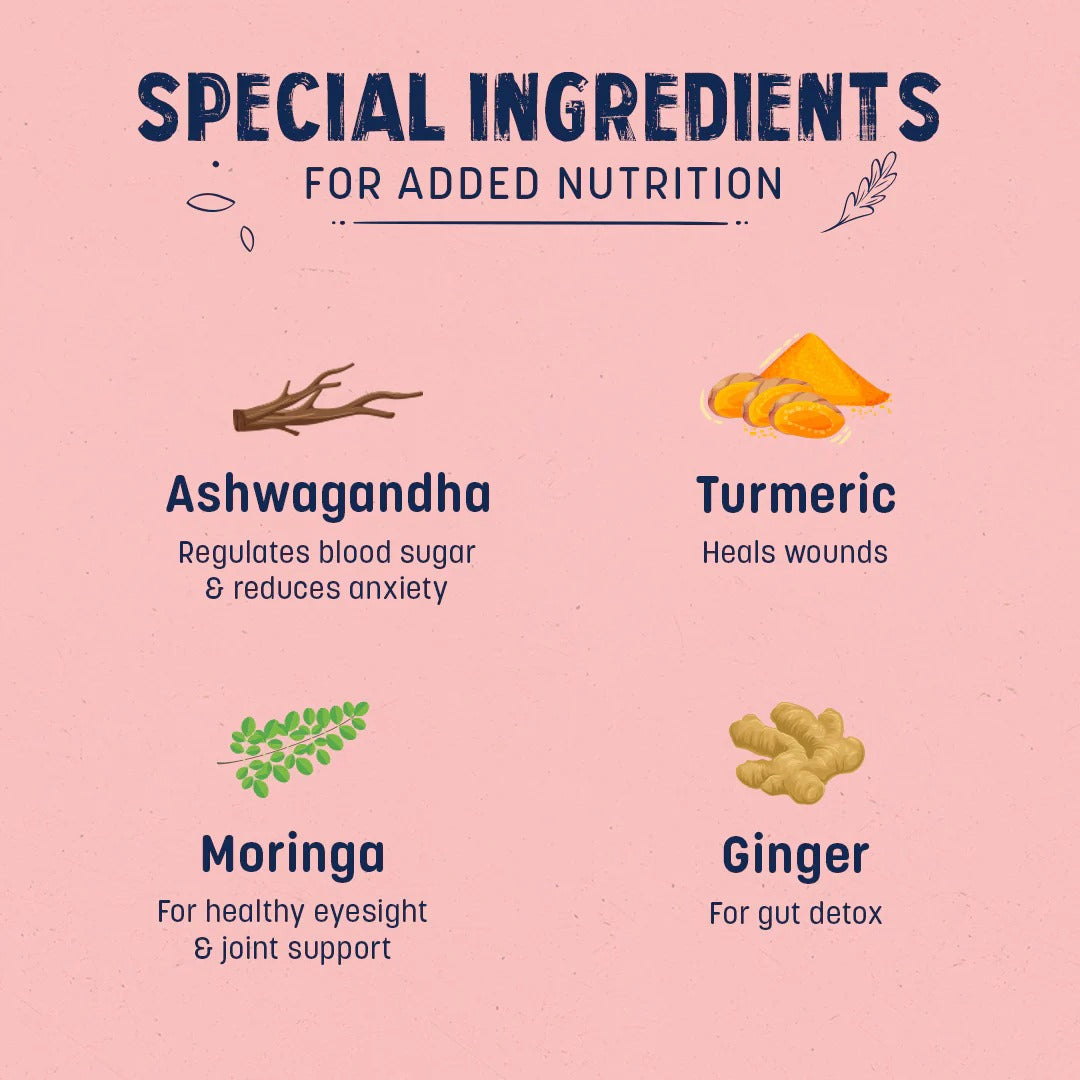 WITH THE GOODNESS OF INDIAN SUPERHERBS: Turmeric, Ginger, Moringa, Ashwagandha, Black Pepper